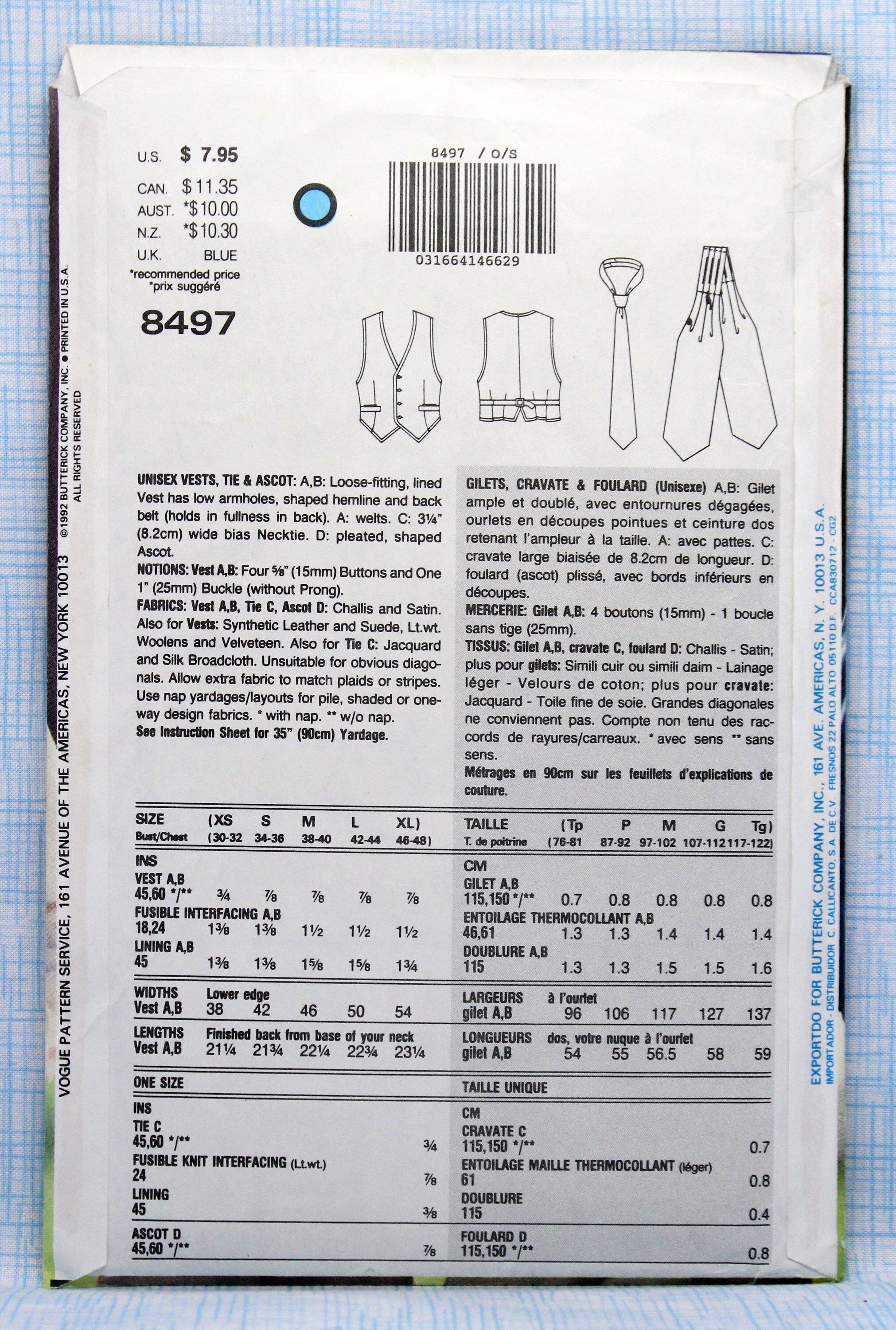 Vogue Sewing Pattern 8497 Unisex Easy Vests Tie And Ascot Etsy